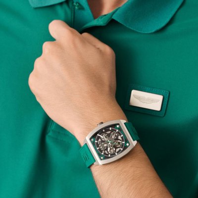 Zegarek marki Aston Martin ma Tytan kopertę 41 mm średnicy i jest wyposażony w pasek z materiału guma. Wewnątrz koperty jest mechanizm Timex i zegarek ma także szkiełko Mineralny.