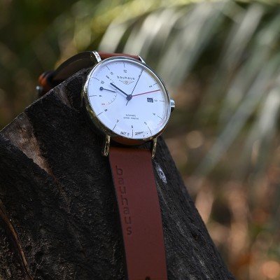 Zegarek marki Bauhaus ma stal chirurgiczna kopertę 41 mm średnicy i jest wyposażony w pasek z materiału skóra. Wewnątrz koperty jest mechanizm Miyota i zegarek ma także szkiełko K1 Mineral.