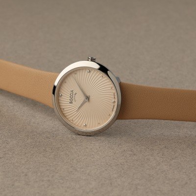 Zegarek marki Boccia ma Tytan kopertę 32 mm średnicy i jest wyposażony w pasek z materiału skóra. Wewnątrz koperty jest mechanizm Miyota i zegarek ma także szkiełko Sapphire.