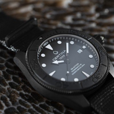 Certina DS Action Diver jest wykonana w kolorze stealth black z uderzającym niebieskim światłem na wskazówkach i indeksach dla optymalnej czytelności w ciemności i pod wodą. Zegarek jest napędzany 25-cewkowym mechanizmem automatycznym 80.611 z 80-godzinną rezerwą chodu. Przy wodoszczelności 30 ATM i jednokierunkowym bezelu jest to wszechstronny zegarek do nurkowania, który spodoba się również miłośnikom stylu nurkowego. Jego matowe czarne wykonanie i miękki czarny plastikowy pasek NATO nadają zegarkowi subtelny sportowy wygląd, dzięki czemu nadaje się do noszenia na co dzień i do uprawiania sportu.