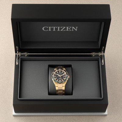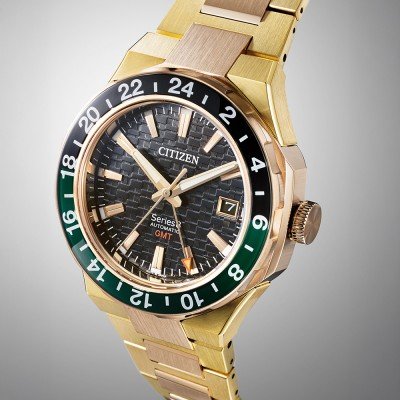 Ten wyjątkowo piękny zegarek Citizen jest również specjalną cechą kolekcji Citizen. Po pierwsze, jest to automatyczny zegarek z linii Series 8. Seria ta składa się z wytrzymałych, ale wysokiej jakości zegarków o sportowym wyglądzie. Po drugie, stalowy zegarek pokryty jest powłoką PVD w dwóch odcieniach złota: żółtym i różowym. To uderzające połączenie kolorów jest dodatkowo wzmocnione przez głęboki zielony bezel, podczas gdy ciemna tarcza z wzorem kafelkowym dodaje jeszcze więcej głębi. Co więcej, jest to wysoce funkcjonalny zegarek GMT: 10 ATM wodoodporności, wyposażony w okienko daty na godzinie 3 oraz czytelną wskazówkę GMT do ustawiania drugiej strefy czasowej. Co więcej, zegarek wykończony jest odpornym na zarysowania szafirowym szkiełkiem zarówno z przodu, jak i z tyłu.