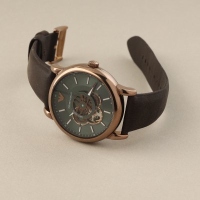Zegarek marki Emporio Armani ma stal chirurgiczna kopertę 43 mm średnicy i jest wyposażony w pasek z materiału skóra. Wewnątrz koperty jest mechanizm Miyota i zegarek ma także szkiełko Mineralny.