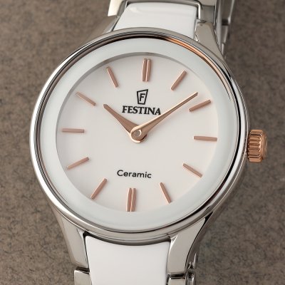 Zegarek marki Festina ma Stal nierdzewna i ceramika kopertę 31 mm średnicy i jest wyposażony w pasek z materiału Ceramiczny. Wewnątrz koperty jest mechanizm Miyota i zegarek ma także szkiełko Mineralny.