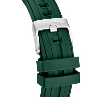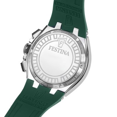 Zegarek marki Festina ma stal chirurgiczna kopertę 46 mm średnicy i jest wyposażony w pasek z materiału guma. Wewnątrz koperty jest mechanizm Miyota i zegarek ma także szkiełko Mineralny.