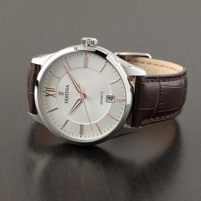 Zegarek marki Festina ma stal chirurgiczna kopertę 43 mm średnicy i jest wyposażony w pasek z materiału skóra. Wewnątrz koperty jest mechanizm Miyota i zegarek ma także szkiełko Mineralny.
