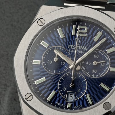 Zegarek marki Festina ma stal chirurgiczna kopertę 42 mm średnicy i jest wyposażony w pasek z materiału stal chirurgiczna. Wewnątrz koperty jest mechanizm Ronda i zegarek ma także szkiełko Sapphire.