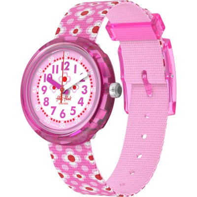 Zegarek marki Flik Flak ma Tworzywa sztuczne pochodzenia biologicznego kopertę 30 mm średnicy i jest wyposażony w pasek z materiału Z materiału. Wewnątrz koperty jest mechanizm ETA i zegarek ma także szkiełko Akryl.
