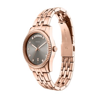 Zegarek marki Fossil ma stal chirurgiczna kopertę 34 mm średnicy i jest wyposażony w pasek z materiału stal chirurgiczna. Wewnątrz koperty jest mechanizm Seiko Instruments Inc. i zegarek ma także szkiełko Mineralny.