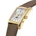 Zegarek Frederique Constant Classics Carrée Moonphase to wyrafinowany i wyjątkowy czasomierz z wieloma funkcjami. Kwarcowy mechanizm FC-265 wskazuje godziny, minuty, sekundy, a także datę, dzień, miesiąc i fazy księżyca, przy imponującej 60-miesięcznej żywotności baterii. Całość zamknięta została w prostokątnej kopercie o wymiarach 42,30 x 30 mm, wykonanej z polerowanej stali szlachetnej pokrytej żółtym złotem. Srebrna tarcza ze słonecznym wykończeniem i wytłoczonym wzorem pośrodku, jest uzupełniona pozłacanymi indeksami i wskazówkami, oferując doskonałą czytelność.