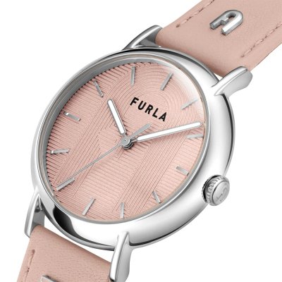 Zegarek marki Furla ma stal chirurgiczna kopertę 38 mm średnicy i jest wyposażony w pasek z materiału skóra.