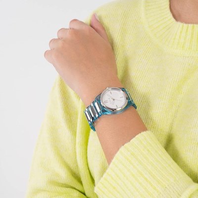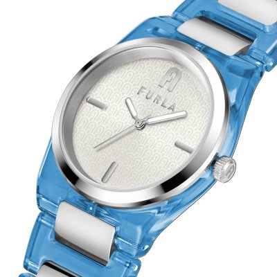 Zegarek marki Furla ma Stal nierdzewna i żywica kopertę 34 mm średnicy i jest wyposażony w pasek z materiału Stal nierdzewna i żywica. Wewnątrz koperty jest mechanizm Miyota i zegarek ma także szkiełko Mineralny.