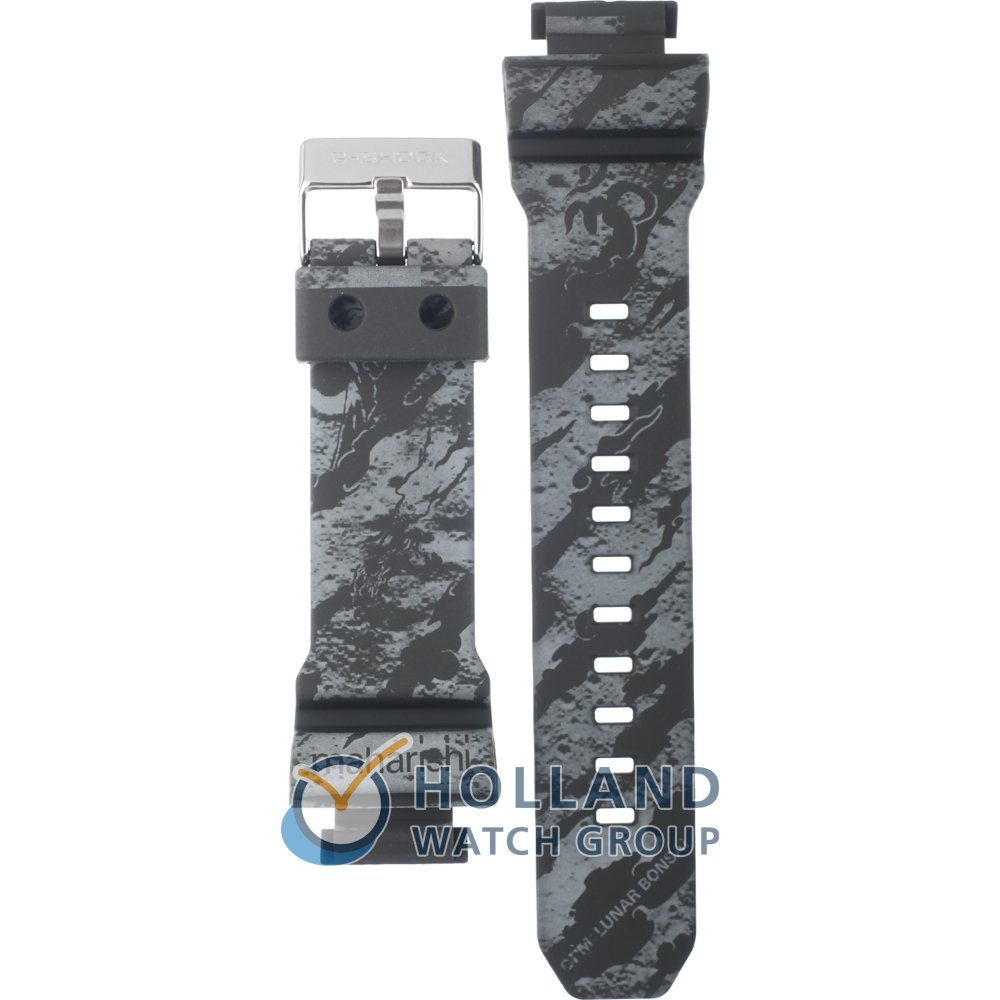 Pasek do zegarka G-Shock jest wykonany z materiału plastik/Żywica syntetyczna i jest zamocowany do zegarka za pomocą… kołki sprężyste. Ten pasek ma szerokość 27.5 mm i zamyka się za pomocą sprzączka. Ten pasek nie ma prostego mocowania, co oznacza, że pasuje wyłącznie do zegarków z poniższej listy.