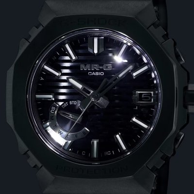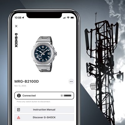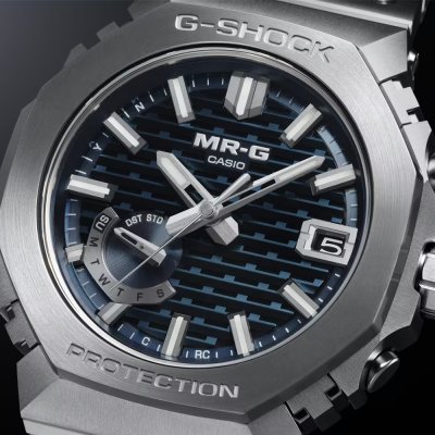 Tarcza zegarka MRG-B2100 na pierwszy rzut oka może wydawać się zwykłą czarną tarczą z teksturą, ale w rzeczywistości ma ona teksturę 3D opartą na japońskiej metodzie obróbki drewna zwanej kigumi. Technika ta polega na łączeniu drewnianych części bez użycia metalowych elementów mocujących. Pozornie prosta konstrukcja z pomysłowymi połączeniami tworzy coś naprawdę wyjątkowego. To samo dotyczy MRG-B2100; oprócz pięknie wykonanej tarczy, zegarek jest studium kunsztu i łączenia innowacyjnych materiałów. Zmontowana w zakładzie Casio Premium Production Line w Yamagata koperta i (27 pojedynczych!) elementów bezela wykonane są z super twardego stopu tytanu Ti64. Górna część bezela wykonana jest z COBARION, stopu, który jest czterokrotnie twardszy niż czysty tytan, a bransoleta wykonana jest z innego specjalnego stopu tytanu, DAT55G, który jest zarówno niezwykle twardy, jak i bardzo podatny na obróbkę. Przy rozmiarze koperty 44,4 × 49,5 × 13,6 mm, jest to średniej wielkości G-Shock, ale doskonale nadający się do noszenia, zwłaszcza ze względu na lekkie materiały, podczas gdy konstrukcja obudowy i bezela z wieloma osłonami zapewnia dodatkową odporność zegarka na wstrząsy. Wszystkie części zegarka są pokryte diamentową powłoką węglową (DLC) dla jeszcze lepszej odporności na zarysowania. Zegarek jest obsługiwany przez moduł Casio 5718, który oprócz regulacji czasu sterowanej radiowo Multiband 6, oferuje parowanie smartfonów przez Bluetooth. Inne funkcje obejmują automatyczny kalendarz do 2099 roku, alarm niskiego poziomu baterii i diodę LED Super Illuminator. Inne funkcje aplikacji to automatyczne przełączanie na czas letni (DST), automatyczna i jednodotykowa korekta czasu, wyszukiwarka telefonów, korekta ustawienia ręki oraz dziennik czasu i miejsca.