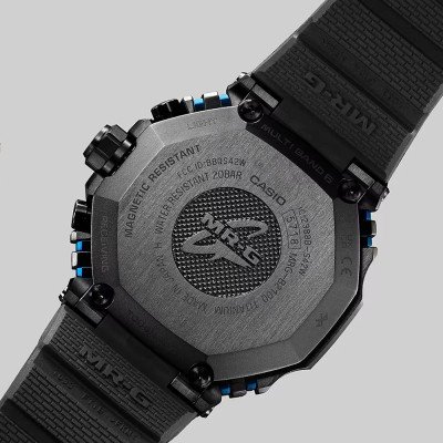 Podobnie jak w modelu MRG-B2100B-1ADR, wydanym wcześniej w 2024 roku, tarcza MRG-B2100R-2ADR jest inspirowana tradycyjną japońską techniką łączenia drewna "kigumi". Jest to widoczne w dwuczęściowej strukturze indeksów i siatki na tarczy. Otworki w tarczy pozwalają światłu padać na znajdujące się pod nią panele słoneczne, które dostarczają zegarkowi energii. MRG-B2100R jest dodatkowo inspirowany japońskim malarstwem tuszem i kaligrafią, z ciemnoniebieskim tuszem ao-zumi. Tarcza jest ciemnoniebieska dzięki obróbce naparowywania, którą podkreśla złota wskazówka sekundowa. Elementy bezela na czterech rogach są zjonizowane kolorem granatowym, a podstawą jest czarna, podobna do diamentowej, powłoka węglowa. Oczywiście zegarek spełnia wszystkie specyfikacje, których można oczekiwać od MR-G: tytanowa koperta Ti64, bateria słoneczna, sterowanie radiowe, Bluetooth i rozbudowane funkcje.