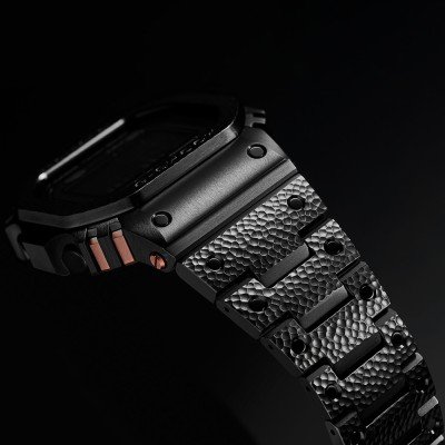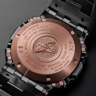 Młotkowana ramka i pasek są wykonane z DAT55G, specjalnego stopu tytanu z Japonii, który jest trzy razy twardszy niż czysty tytan. Każdy egzemplarz jest ręcznie wykonany przez mistrza tsuiki Kazuya Watanabe. Unikalny wzór każdego zegarka jest tworzony przez kształt jego dłuta i siłę, z jaką uderza. Obudowa ma srebrno-szary kolor z subtelnym połyskiem, inspirowanym tradycyjnymi detalami miecza. Dzięki twardej powłoce DLC, ten wygląd również został zachowany. Śruby i przyciski w kolorze miedzi dodają luksusowego, uderzającego akcentu do projektu. Potężny zegarek, który łączy tradycyjną japońską estetykę z czystą wytrzymałością G-SHOCK. Ten MR-G słusznie należy do absolutnie najlepszych modeli marki.