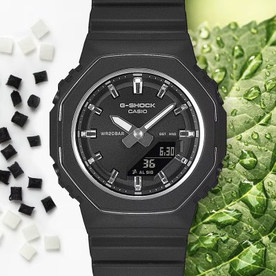 Zegarek marki G-Shock ma Tworzywa sztuczne pochodzenia biologicznego kopertę 40.2 mm średnicy i jest wyposażony w pasek z materiału Tworzywa sztuczne pochodzenia biologicznego. Wewnątrz koperty jest mechanizm Casio i zegarek ma także szkiełko Mineralny.
