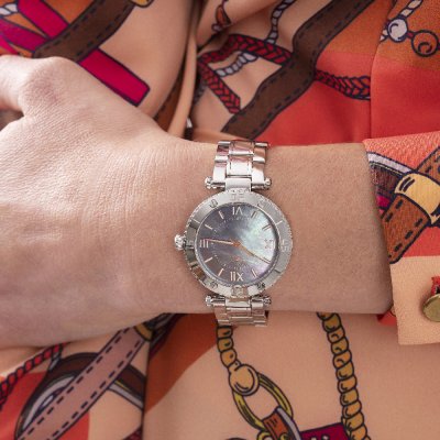 Zegarek marki GC ma stal chirurgiczna kopertę 34 mm średnicy i jest wyposażony w pasek z materiału metal. Wewnątrz koperty jest mechanizm Ronda i zegarek ma także szkiełko Szkiełko mineralne pokryte warstwą szafirową.