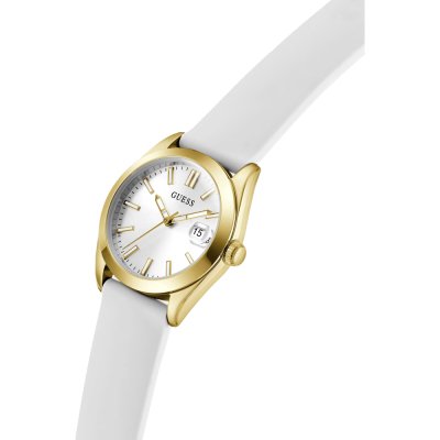 Zegarek marki Guess ma stal chirurgiczna kopertę 32 mm średnicy i jest wyposażony w pasek z materiału guma. Wewnątrz koperty jest mechanizm Seiko Instruments Inc. i zegarek ma także szkiełko Mineralny.