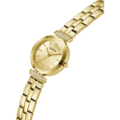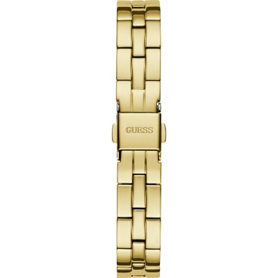 Zegarek marki Guess ma stal chirurgiczna kopertę 28 mm średnicy i jest wyposażony w pasek z materiału stal chirurgiczna.