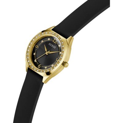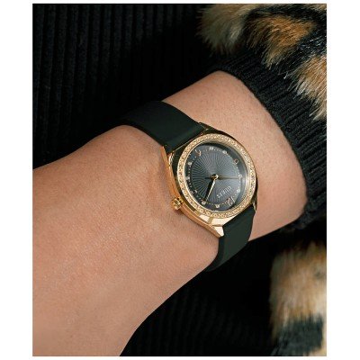 Zegarek marki Guess ma stal chirurgiczna kopertę 30 mm średnicy i jest wyposażony w pasek z materiału guma. Wewnątrz koperty jest mechanizm Seiko i zegarek ma także szkiełko Mineralny.