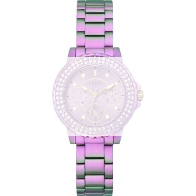 Pasek do zegarka Guess jest wykonany z materiału metal i jest zamocowany do zegarka za pomocą… kołki sprężyste. Ten pasek ma szerokość 16 mm i zamyka się za pomocą zapięcie zatrzaskowe z przyciskami. Ten pasek nie ma prostego mocowania, co oznacza, że pasuje wyłącznie do zegarków z poniższej listy.