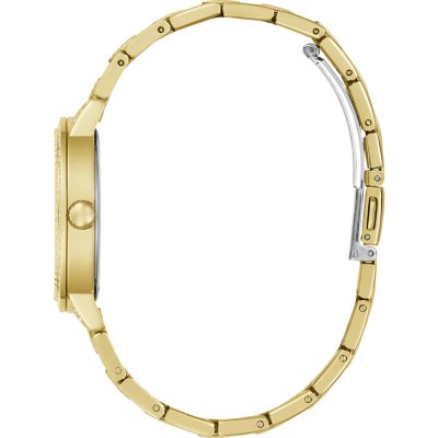 Zegarek marki Guess ma stal chirurgiczna kopertę 34 mm średnicy i jest wyposażony w pasek z materiału stal chirurgiczna.