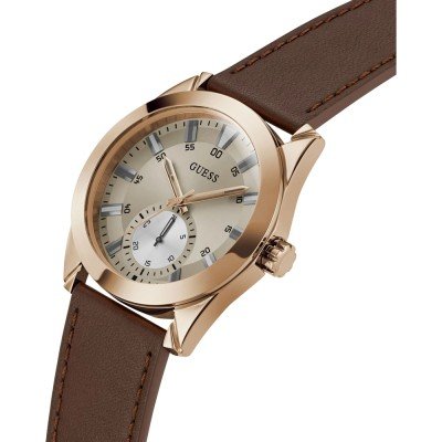 Zegarek marki Guess ma stal chirurgiczna kopertę 44 mm średnicy i jest wyposażony w pasek z materiału skóra.