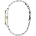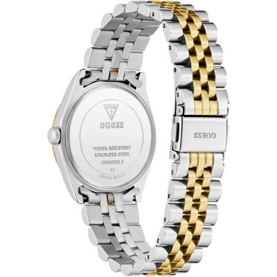 Zegarek marki Guess ma stal chirurgiczna kopertę 34 mm średnicy i jest wyposażony w pasek z materiału stal chirurgiczna.