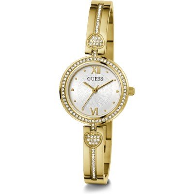 Zegarek marki Guess ma stal chirurgiczna kopertę 27 mm średnicy i jest wyposażony w pasek z materiału stal chirurgiczna.