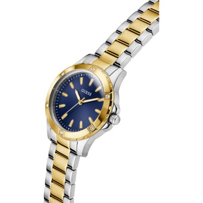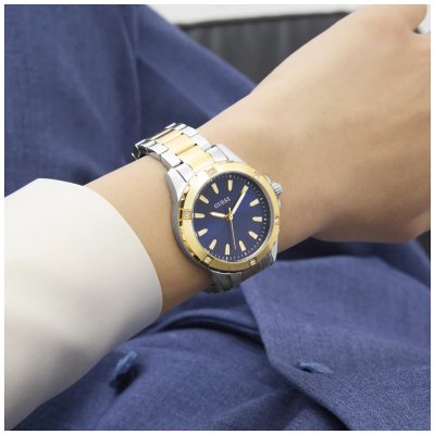 Zegarek marki Guess ma stal chirurgiczna kopertę 35 mm średnicy i jest wyposażony w pasek z materiału stal chirurgiczna. Wewnątrz koperty jest mechanizm Seiko i zegarek ma także szkiełko Mineralny.