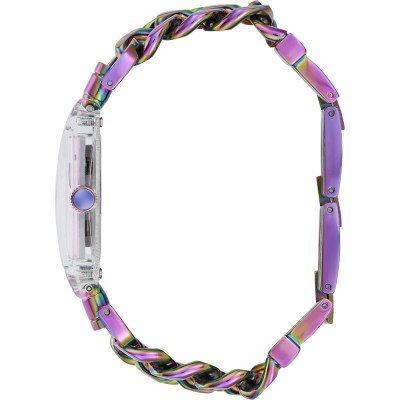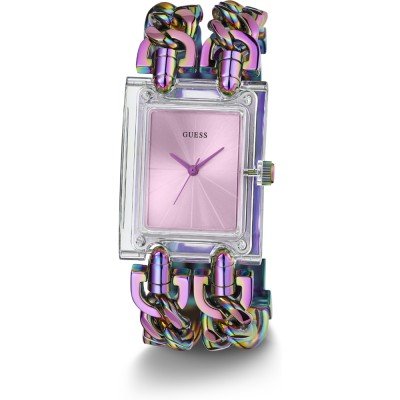 Zegarek marki Guess ma stal chirurgiczna kopertę 29 mm średnicy i jest wyposażony w pasek z materiału stal chirurgiczna.