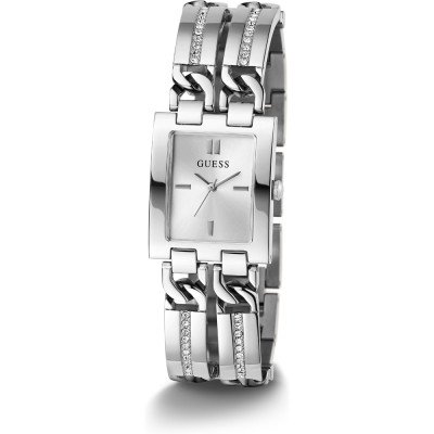 Zegarek marki Guess ma stal chirurgiczna kopertę 24 mm średnicy i jest wyposażony w pasek z materiału stal chirurgiczna.