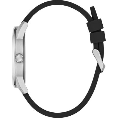 Zegarek marki Guess ma stal chirurgiczna kopertę 42 mm średnicy i jest wyposażony w pasek z materiału guma.