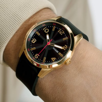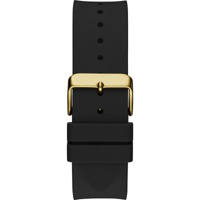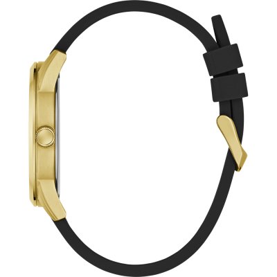 Zegarek marki Guess ma stal chirurgiczna kopertę 42 mm średnicy i jest wyposażony w pasek z materiału guma.