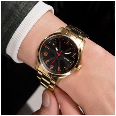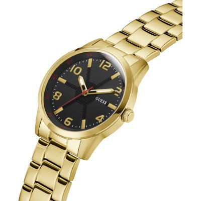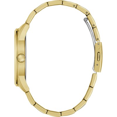 Zegarek marki Guess ma stal chirurgiczna kopertę 42 mm średnicy i jest wyposażony w pasek z materiału stal chirurgiczna.