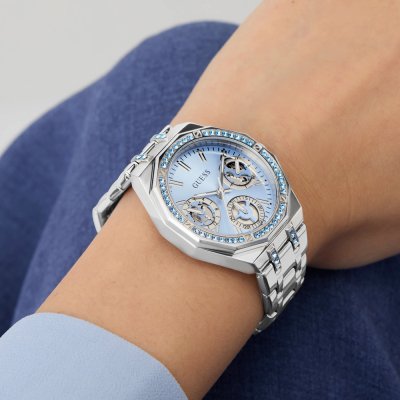 Zegarek marki Guess ma stal chirurgiczna kopertę 36 mm średnicy i jest wyposażony w pasek z materiału stal chirurgiczna. Wewnątrz koperty jest mechanizm Seiko Instruments Inc. i zegarek ma także szkiełko Mineralny.