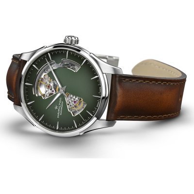 Jako jedna z najbardziej charakterystycznych linii zegarków Hamiltona, Jazzmaster jest prawdopodobnie najbardziej wyrafinowany i elegancki, skłaniając się ku ekskluzywności pod względem wykończenia i wzornictwa. Model "Open Heart" posiada wyciętą tarczę, która odsłania kluczowe obszary mechanizmu. W ten sposób czytelność zegarka pozostaje w dużej mierze nienaruszona, ale także nadaje mu charakterystyczny wygląd. Na wyświetlaczu znajdują się niektóre rubiny zegarka oraz mechanizm przekładni, zapadka i koło balansowe. Sama tarcza jest wykończona radialnym szlifem słonecznym z nakładanymi indeksami w kształcie pastylki i wskazówkami Dauphine pod szafirowym szkiełkiem. Mechanizm H-10 to niezawodny koń roboczy Hamiltona ze sprężyną balansową Nivachron i 80-godzinną rezerwą chodu.