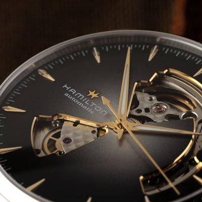 Jako jedna z najbardziej charakterystycznych linii zegarków Hamiltona, Jazzmaster jest prawdopodobnie najbardziej wyrafinowany i elegancki, skłaniając się ku ekskluzywności pod względem wykończenia i wzornictwa. Model "Open Heart" posiada wyciętą tarczę, która odsłania kluczowe obszary mechanizmu. W ten sposób czytelność zegarka pozostaje w dużej mierze nienaruszona, ale także nadaje mu charakterystyczny wygląd. Na wyświetlaczu znajdują się niektóre rubiny zegarka oraz mechanizm przekładni, zapadka i koło balansowe. Sama tarcza jest wykończona radialnym szlifem słonecznym z nakładanymi indeksami w kształcie pastylki i wskazówkami Dauphine pod szafirowym szkiełkiem. Mechanizm H-10 to niezawodny koń roboczy Hamiltona ze sprężyną balansową Nivachron i 80-godzinną rezerwą chodu.