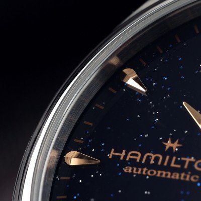 Najnowszym dodatkiem do serii Jazzmaster Open heart dla kobiet jest ta wspaniała niebieska tarcza, której struktura inspirowana jest kamieniem szlachetnym awenturynem. Głęboki błękit i połyskujący, lśniący efekt tworzą hipnotyzujący wygląd, przyciągając wzrok do automatycznego mechanizmu H-10 - z 80-godzinną rezerwą mocy - pokazującego się przez otwór w tarczy. Elegancja i tajemniczość połączone z odrobiną luksusu.