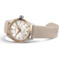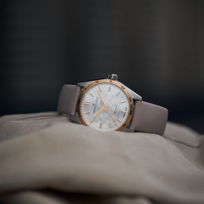 Nowa seria zegarków Performer to bardziej sportowy, nowoczesny i dynamiczny dodatek do linii Hamilton Jazzmaster. Występuje w trzech różnych modelach. Dostępny jest 42-milimetrowy chronograf i zegarki automatyczne w rozmiarze 38 mm oraz ta 34-milimetrowa wersja. Zegarek posiada bezel z 5-minutowymi cyframi przyrostowymi, co nadaje sportowy charakter dość klasycznemu zegarkowi. Układ tarczy jest przejrzysty, a dzięki cieńszemu mechanizmowi Hamilton H-10 (ulepszona wersja niezawodnej ETA 2824) koperta ma smukły i elegancki profil. Tarcza z masy perłowej pięknie komponuje się ze wskazówkami i indeksami w kolorze różowego złota, a także miękkim skórzanym paskiem. Wszystko to sprawia, że Jazzmaster Performer jest idealnym damskim zegarkiem dla tych, którzy lubią nosić codzienny zegarek, który nie jest zbyt klasyczny w swoim wyglądzie.
