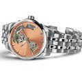 Hamilton Jazzmaster Viewmatic doskonale równoważy styl formalny i sportowy, łącząc pięknie wykończoną kopertę z mieszanką powierzchni polerowanych na wysoki połysk i szczotkowanych oraz intrygującą tarczę w kształcie serca, która eksponuje elementy mechaniczne bijące pod spodem. Wykwintnie wykonane wycięcia w tarczy mają fazę polerowaną na wysoki połysk, przechodzącą ostro w szczotkowaną krawędź wewnętrzną, kierując wzrok na automatyczny mechanizm H-10. Ten bardzo dokładny mechanizm Hamilton zawiera niemagnetyczną sprężynę balansową Nivachron i ma rezerwę chodu nie mniejszą niż 80 godzin. Jazzmaster Viewmatic Open Heart Auto jest dostępny w różnych kolorach i w rozmiarach koperty 40 mm i 36 mm, zarówno dla mężczyzn, jak i kobiet.