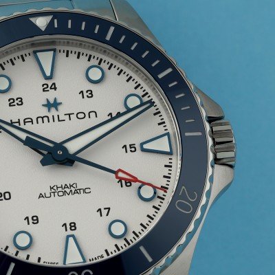 Hamilton Khaki Navy Scuba to klasyczny i dobrze wyposażony zegarek do nurkowania. Kwarcowa wersja tego zegarka jest już w kolekcji od kilku lat, a ta automatyczna wersja jest mile widzianym dodatkiem. Obramowanie kopułowego i antyrefleksyjnego szafirowego szkiełka stanowi jednokierunkowy bezel z polerowaną ceramiczną wkładką i wygrawerowaną 60-minutową skalą. Indeksy godzinowe pięknie kontrastują z tarczą dzięki obramowanym znacznikom z SuperLuminovą dla dodatkowej widoczności w ciemności. Dodatkowa skala godzinowa 13-24 i ostro zakończony sekundnik stanowią ukłon w stronę militarnego dziedzictwa marki. Zegarek napędzany jest mechanizmem kalibru H-10 - znanym również jako Powermatic 80 - z rezerwą mocy wynoszącą 80 godzin. Dzięki niezawodnemu mechanizmowi, solidnej konstrukcji i wodoodporności 30 bar, Hamilton Khaki Navy Scuba Automatic to wszechstronny zegarek do nurkowania z mnóstwem stylu!