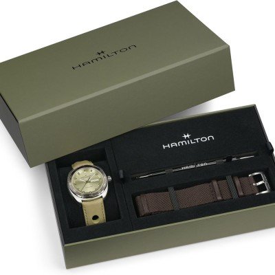Zegarek marki Hamilton ma stal chirurgiczna kopertę 42 mm średnicy i jest wyposażony w pasek z materiału skóra. Wewnątrz koperty jest mechanizm ETA i zegarek ma także szkiełko Sapphire.