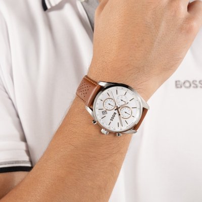Zegarek marki Hugo Boss ma stal chirurgiczna kopertę 44 mm średnicy i jest wyposażony w pasek z materiału skóra. Wewnątrz koperty jest mechanizm Seiko Instruments Inc. i zegarek ma także szkiełko Mineralny.