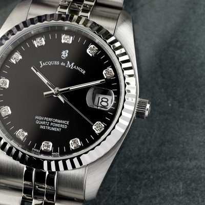 Zegarek marki Jacques du Manoir ma stal chirurgiczna kopertę 36 mm średnicy i jest wyposażony w pasek z materiału stal chirurgiczna. Wewnątrz koperty jest mechanizm Ronda i zegarek ma także szkiełko Mineralny.