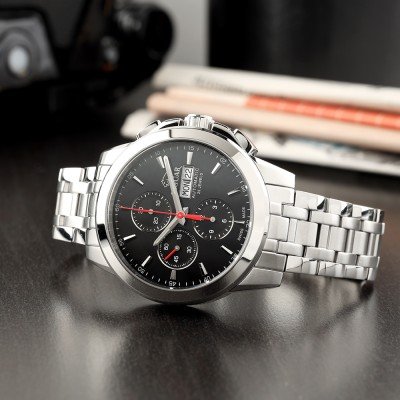 Od momentu założenia w 1938 roku, Jaguar koncentruje się na precyzyjnym szwajcarskim zegarmistrzostwie, aby osiągnąć najwyższą niezawodność i dokładność. Ten J975 Acamar z serii "Le Chronographe" to automatyczny zegarek ze szwajcarskim mechanizmem Valjoux 7750-3H104; Kaliber o sprawdzonej jakości i precyzji przez lata. Komplikacja chronografu mierzy upływający czas w jednostkach 1 sekundy przez 12 godzin, 30 minut i 60 sekund, a jego wydłużona wskazówka minutowa "dotyka" ścieżki minutowej w celu dokładnego wyświetlania czasu. Antyrefleksyjne szafirowe szkiełko zapewnia wyjątkową widoczność tarczy i odporność na zarysowania. To piękny i niezawodny zegarek, który z pewnością przypadnie do gustu miłośnikom klasycznych męskich zegarków!