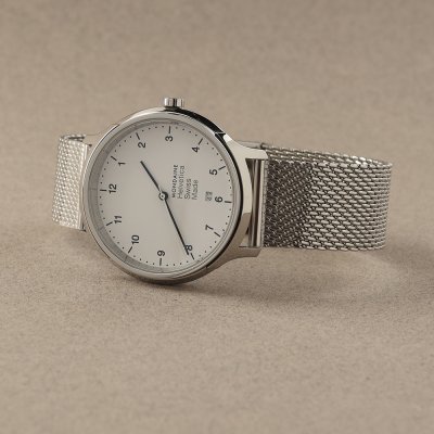 Zegarek marki Mondaine ma stal chirurgiczna kopertę 40 mm średnicy i jest wyposażony w pasek z materiału metal. Wewnątrz koperty jest mechanizm Ronda i zegarek ma także szkiełko Sapphire.