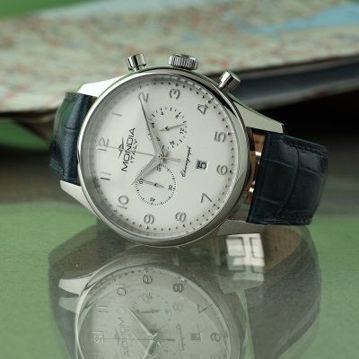 Zegarek marki Mondia ma stal chirurgiczna kopertę 43 mm średnicy i jest wyposażony w pasek z materiału skóra. Wewnątrz koperty jest mechanizm Miyota i zegarek ma także szkiełko Mineralny.