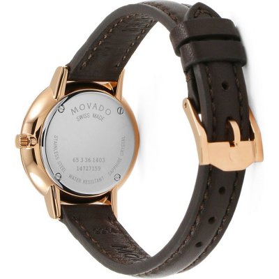 Zegarek marki Movado ma stal chirurgiczna kopertę 28 mm średnicy i jest wyposażony w pasek z materiału skóra. Wewnątrz koperty jest mechanizm ETA i zegarek ma także szkiełko Sapphire.