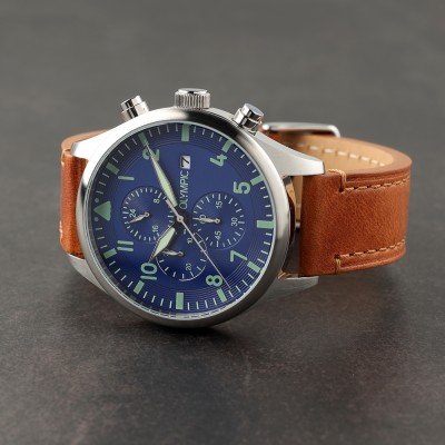 Zegarek marki Olympic ma stal chirurgiczna kopertę 44 mm średnicy i jest wyposażony w pasek z materiału skóra. Wewnątrz koperty jest mechanizm Miyota i zegarek ma także szkiełko Mineralny.